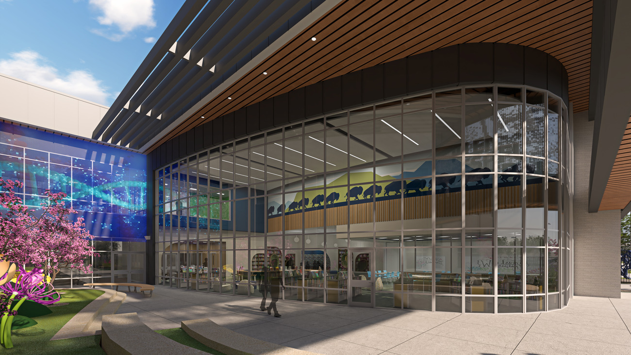 Finally, outside the library, a transparent LED media façade faces the reading garden. This innovative mesh system creates dynamic, large-scale visual displays. When active, it transforms the outdoor space into an immersive environment, blending the grounding presence of nature with the limitless possibilities of the digital world. When not in use, the façade serves as a sunshade, reducing direct solar exposure on the south-facing curtain wall and improving energy efficiency. Beyond its functional benefits, this feature opens opportunities for impactful presentations during the school day, as well as at night for PTA meetings and special events, making the space a true hub for learning and community engagement.