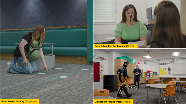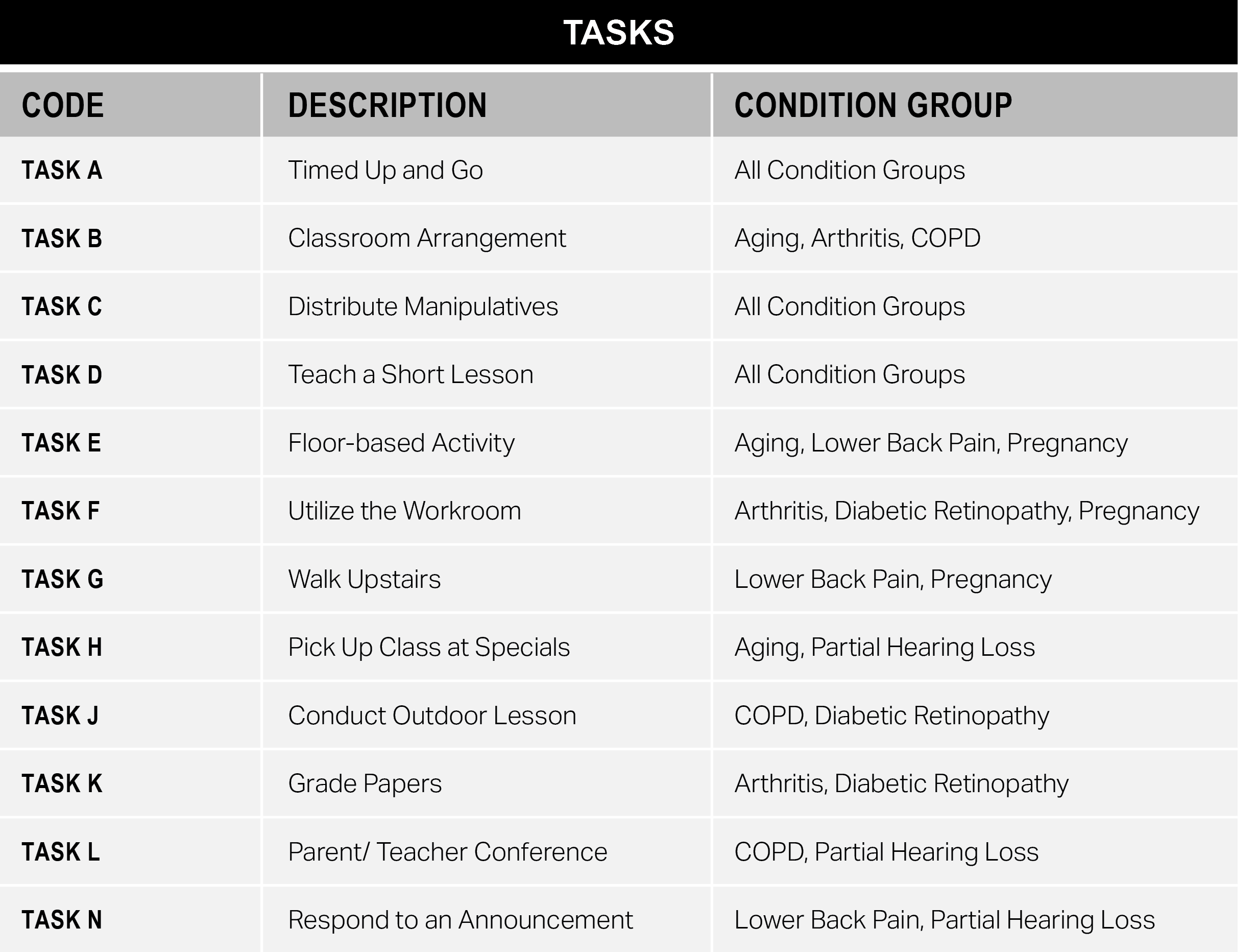 Together, they influence not only how educator complete tasks but also how capable, confident, and supported they feel in their professional roles. These factors were measured by engaging participants in high-fidelity tasks commonly encountered in an education environment. Educators performed the tasks both without and with a disability simulator that introduced a range of conditions — visible and invisible, as well as chronic and temporary. These conditions included Aging, Arthritis, COPD, Diabetic Retinopathy, Lower Back Pain, Partial Hearing Loss and Pregnancy.