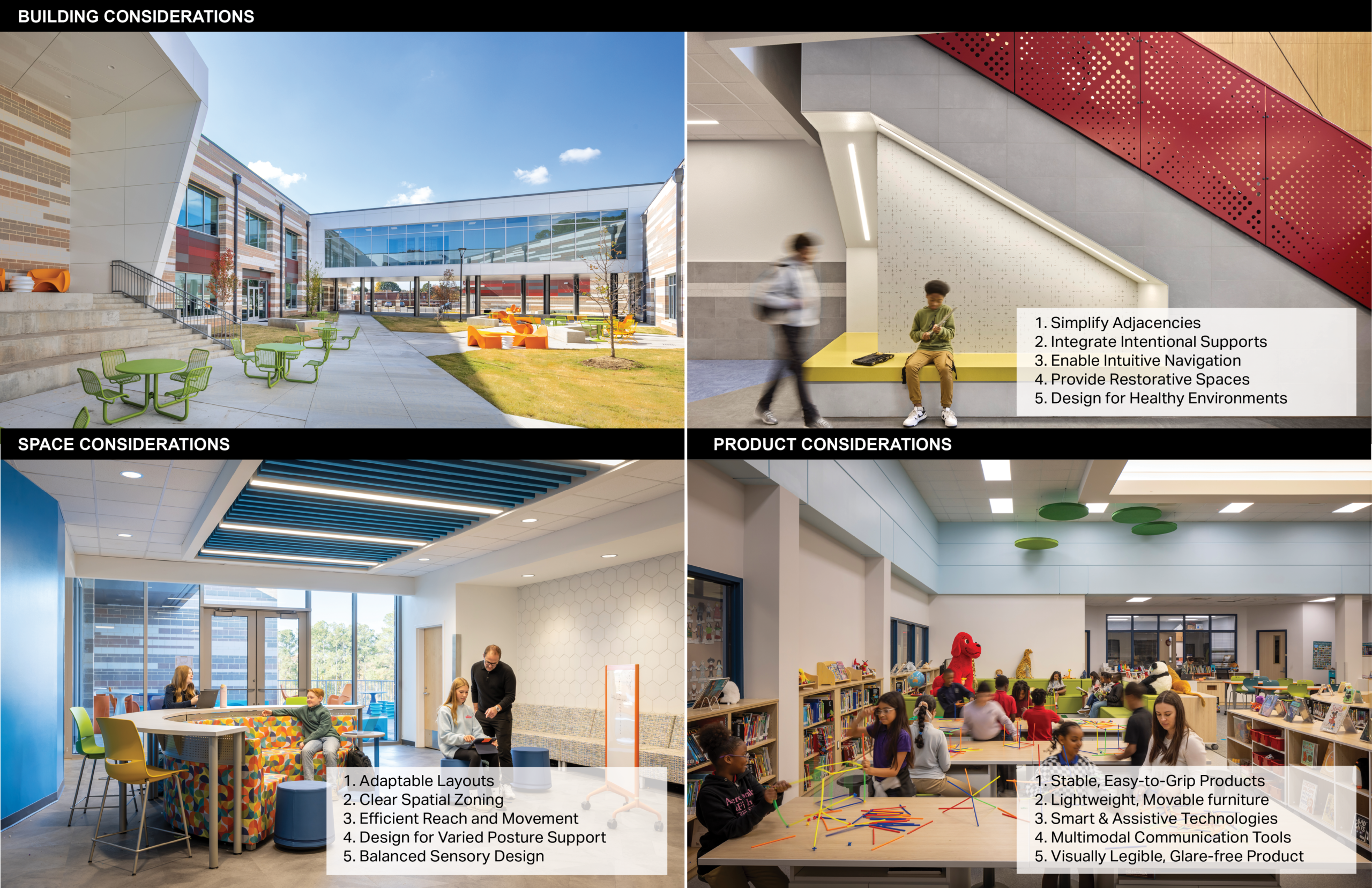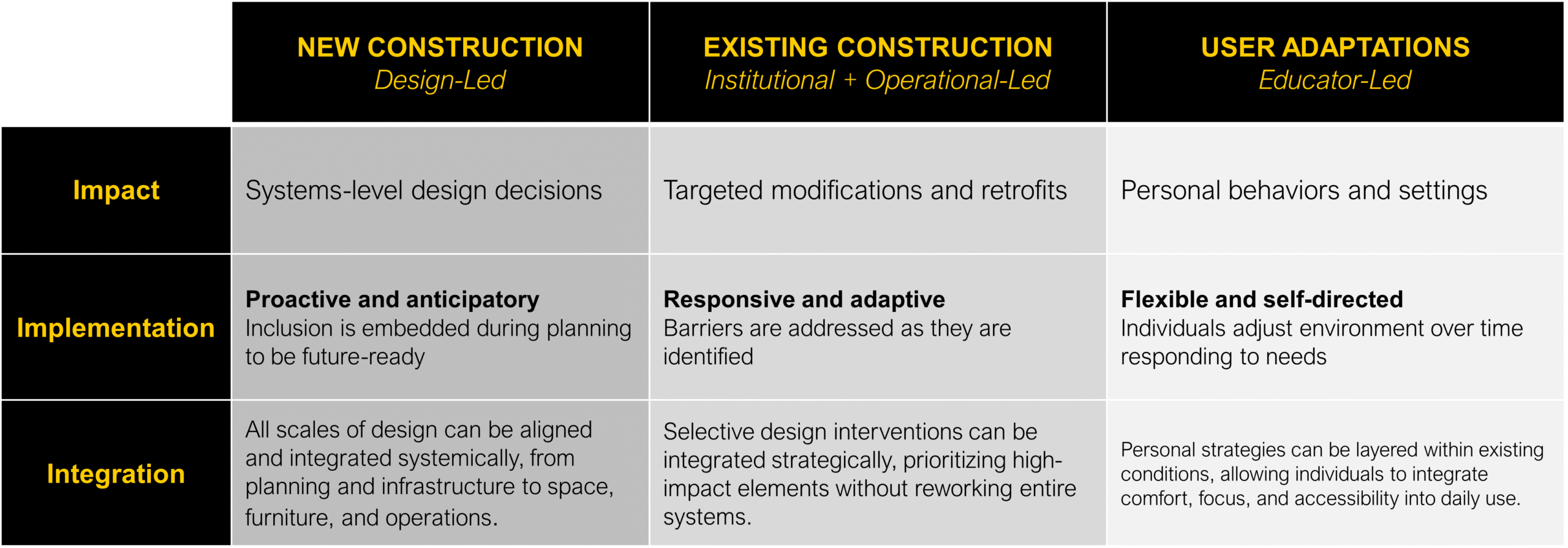 Grounded in a co-creation process with educators, designers, and researchers, the following examples illustrate how these design implications translate into practice. Organized across building, space, product, user, and operational scales, they highlight key considerations and demonstrate how inclusive environments are shaped through interconnected layers. Together, these strategies align the physical environment with user needs and operational intent, enabling consistent and scalable impact.